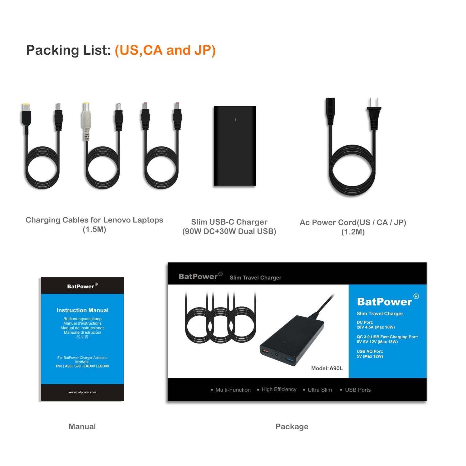 Huge 120W Power Delivery with the A90 Slim Charger: A 90W DC port provides enough power to charge a laptop or BatPower ProE 2 External Battery at full speed, while 36W USB QC ports provide optimized charging to tablets smartphones and more.