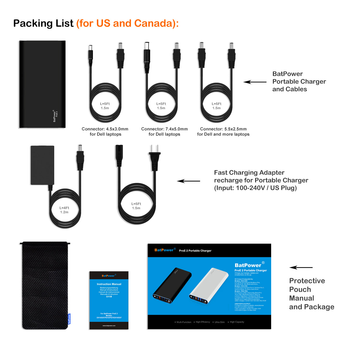 Packing list: ProE2 External Battery + Charger + Laptop Charging Cables + AC Cord + Manual. (Note: if Sold by Euro, will be packed UK and EU Power Cords).
