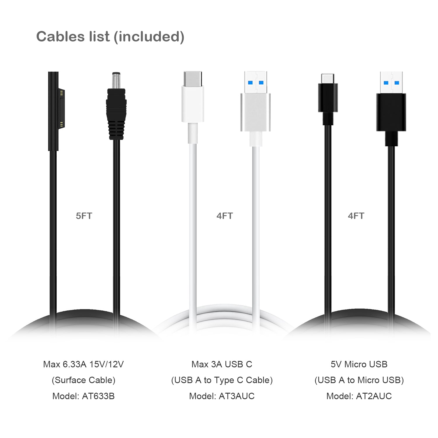 AT External Battery DC port output (95W): Maximum power delivery for Microsoft Surface laptops or tablets (list of compatible models)