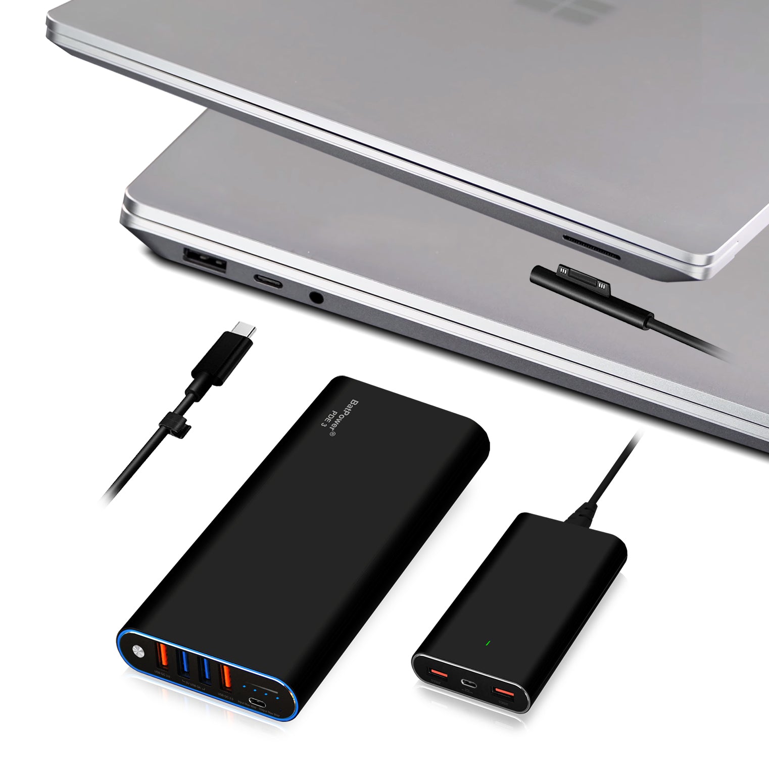 BatPower PDE 3 Surface Laptop USB-C Laptop External Battery and Slim Charger Combo with 120W High Power Delivery for Microsoft Surface Laptop USB-C External Battery Surface Pro Power Bank PD USB-C Portable Charger 98Wh/26800mAh 148Wh/40000mAh 210Wh/56000mAh